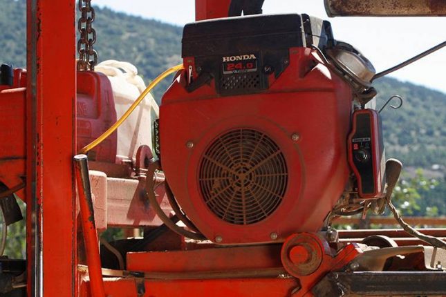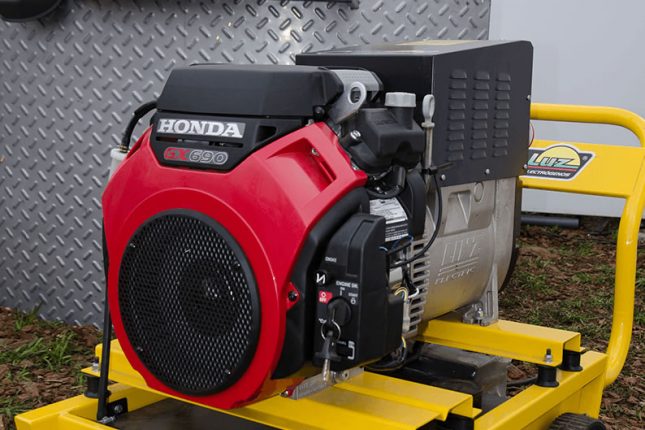 Motor estacionario de 4 tiempos de 26 HP, bicilindrico en V, con sistema OHV (válvulas a la cabeza), eje horizontal con arranque eléctrico y alerta de aceite que hace detener el equipo en caso de bajo nivel de aceite.